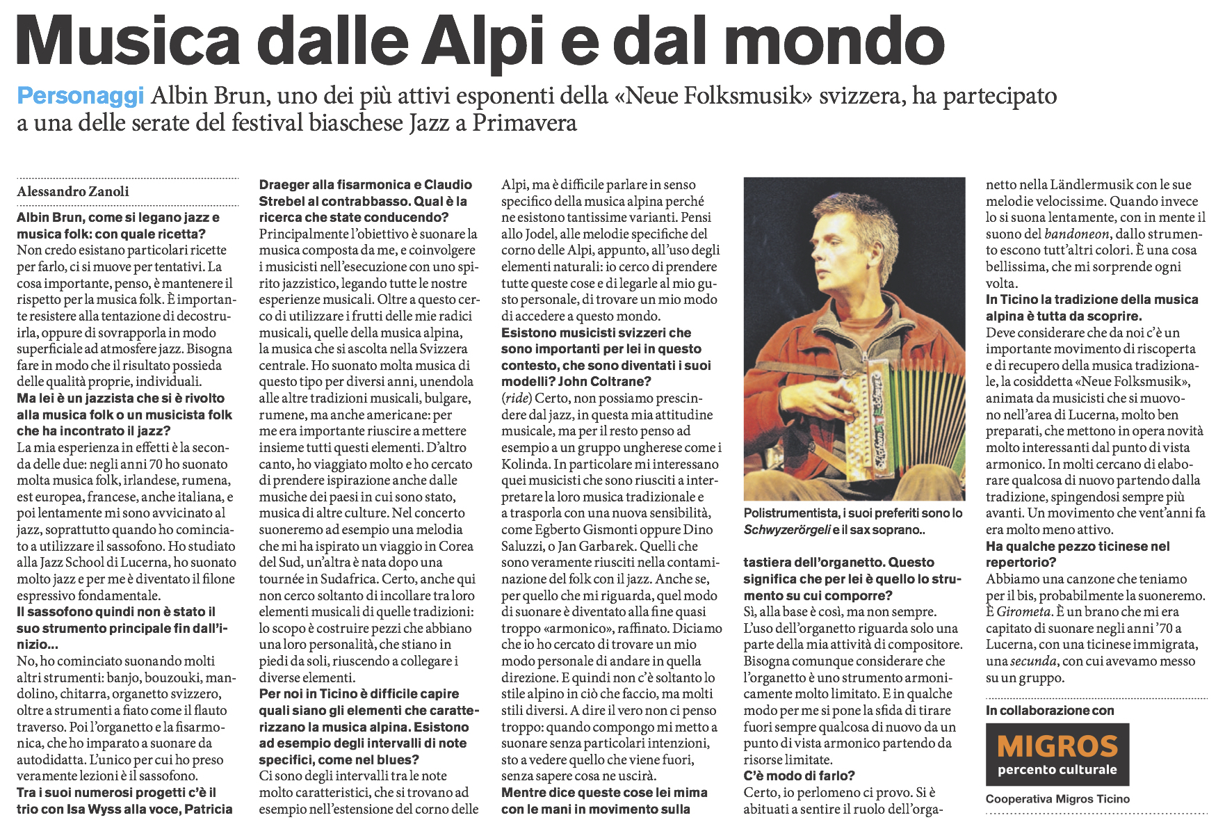 Albin Brun ist sich bewusst, dass die Verbindung von Volksmusik und Jazz inzwischen eine Modeströmung geworden ist „und man schnell in den Verdacht gerät, auf einen fahrenden Zug aufzuspringen“. Es sei nie seine Intention gewesen, die einheimische Volksmusik zu erneuern oder Ländler aufzupeppen. „Ich will meine eigene Musik machen, mit dem, was hier gewachsen ist, aber trotzdem mit einem weiten Horizont.“ Das freie Spiel ist nach wie vor wichtig. Mit Heimattümelei hat er nichts am Hut. „An der Schweizer Volksmusik schätze ich besonders die archaischen Sachen wie Zäuerli, Naturjuuz, Chüereihen, Alphorn. Aber das ist ein heikles Gebiet. Da kann man nicht selten in eine komische Nachbarschaft geraten.“