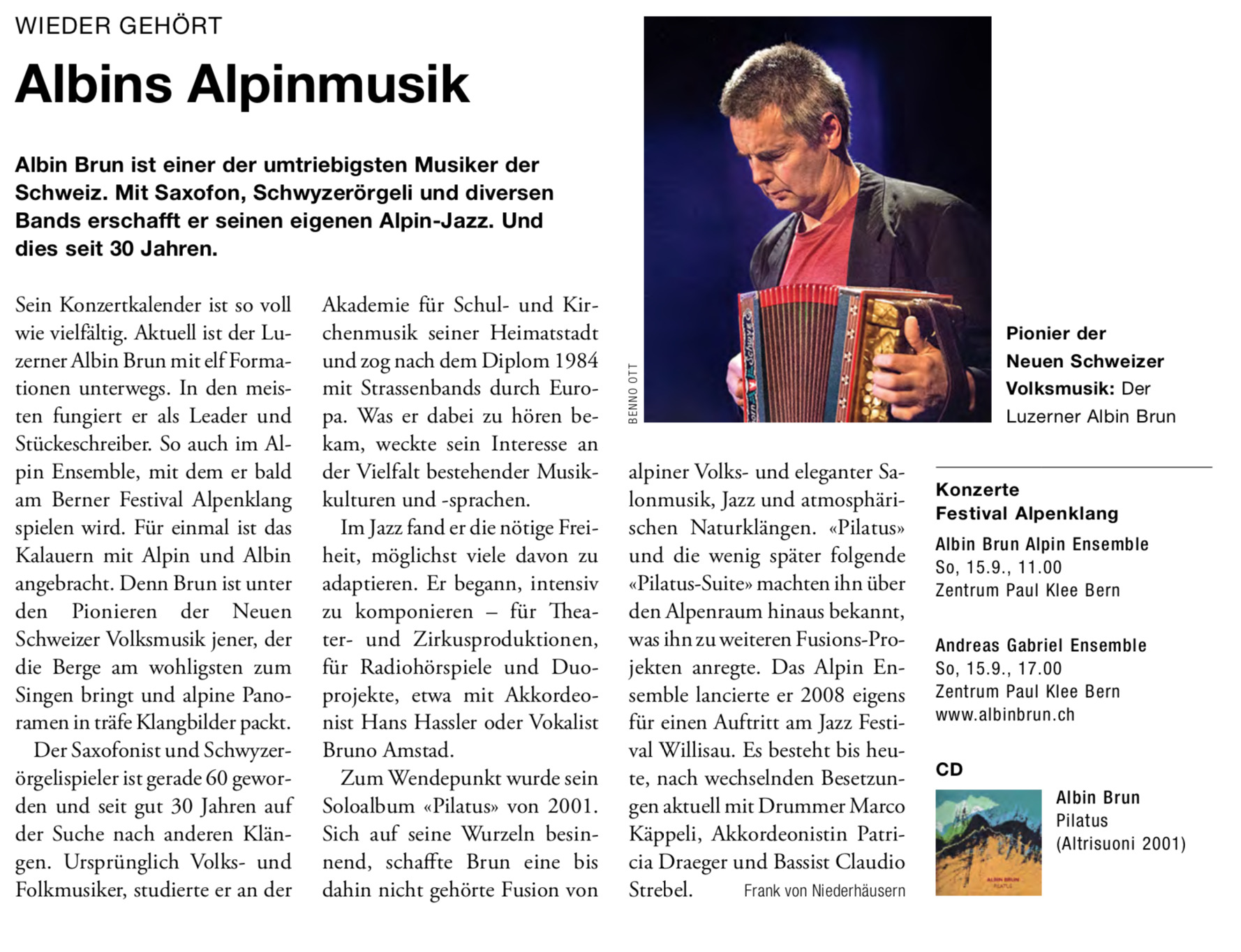 Letztes Jahr erschien die CD „Pilatus-Suite“, auf der Albin Brun seine alpin gefärbte Musik weiter entwickelt hat. Diesmal kam der Anstoss vom Festival „Alpentöne“ in Altdorf. Er wurde eingeladen, das Pilatus-Projekt aufzuführen. Nur: Wie sollte er das technisch bewerkstelligen? Die Lösung war bald klar: „Ich stellte eine Band zusammen, arrangierte die Stücke um, ergänzte sie und schrieb neue Kompositionen. Dann brachte ich alles in eine suitenartige Abfolge.“ Albins Alpin Quintett war geboren.