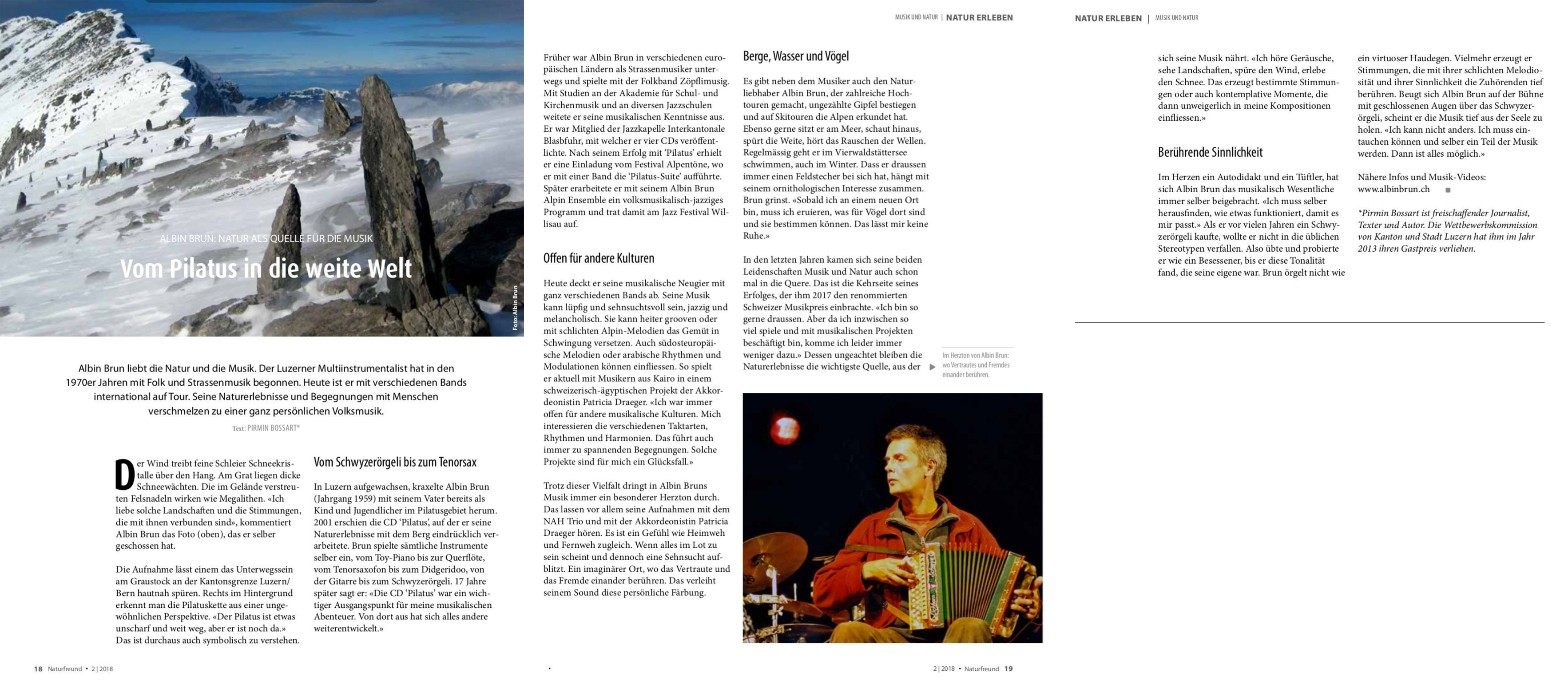 Als einen „absoluten Glücksfall“ bezeichnet Albin Brun diesen Preis – womit doch einmal bewiesen wäre, dass lokale Kulturförderung nicht nur eine schulterklopfende Pflichtübung ist, sondern auch Neues in Gang setzt. „Pilatus“ wurde eine Solo-CD, die Albin Brun im Overdub-Verfahren in seinem Atelier einspielte. Teils legte er bis zu 18 Spuren übereinander, in immer wieder neuen Konstellationen von diversen Saxophonen, Akkordeon, Gitarre, Toy-Piano, Piano, diversen Flöten, Feldaufnahmen, Stimme, Spielzeuginstrumenten, Alltagsgegenständen, Melodica und Perkussion. Dazu kam für einige Stücke die Stimme von Bruno Amstad, mit dem er seit Jahren immer wieder im Duo auftritt.