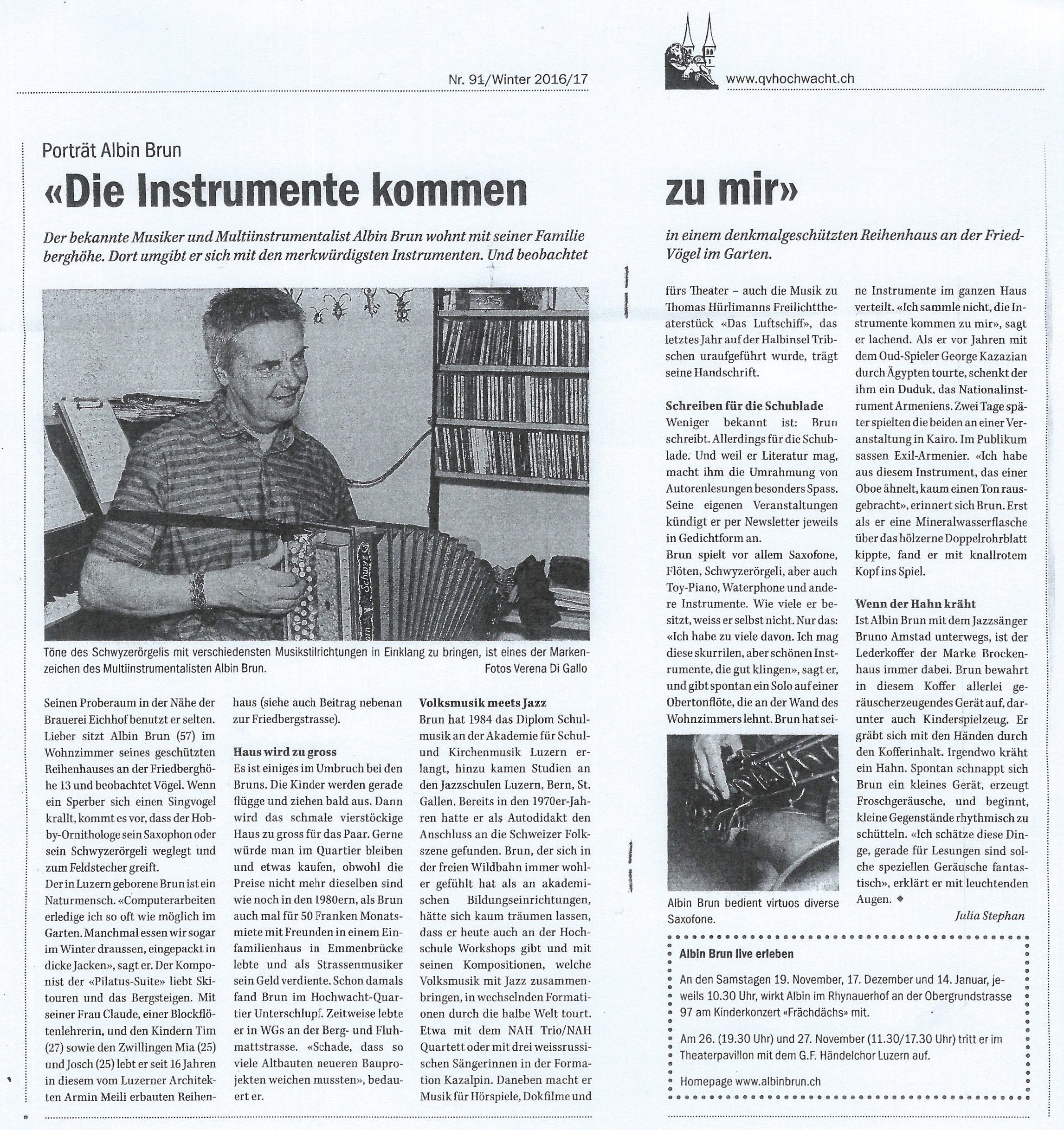 Lange ist´s her, da Albin Brun als Strassenmusiker durch Europa tingelte, unbeschwert in den Tag hinein lebte, sich mit Gelegenheitsjobs über Wasser hielt, aber die Musik immer zuvorderst stellte, alle möglichen Instrumente spielte, an jeder Ecke und wo immer eine Kleinbühne frei war. Es war die Folkzeit der Siebziger Jahre. Festival Lenzburg. Folkclub Luzern. Alte Schweizer Lieder, Irisches, Rumänisches, Süditalienisches, Learning by doing. Eine Szene ohne Künstlichkeit und Kulturmanager. Es war die Basis, die so lange gehalten hat, dass Albin Brun nach Jahren mit Jazz, Theatermusik und freier Improvisation plötzlich wieder dort war, von wo er aufgebrochen war. Bei den alten Klängen, die er neu transformierte.
